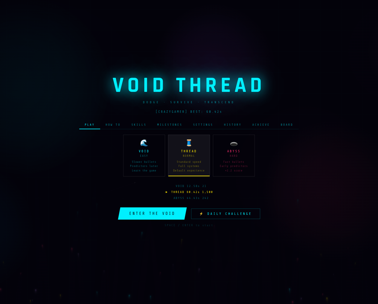 VOID THREAD is a browser-based bullet-hell survival game. You are a signal threading through an infinite void. Bullets spawn from every edge. One hit ends everything.