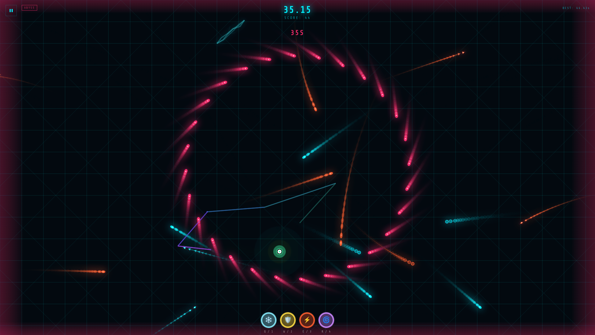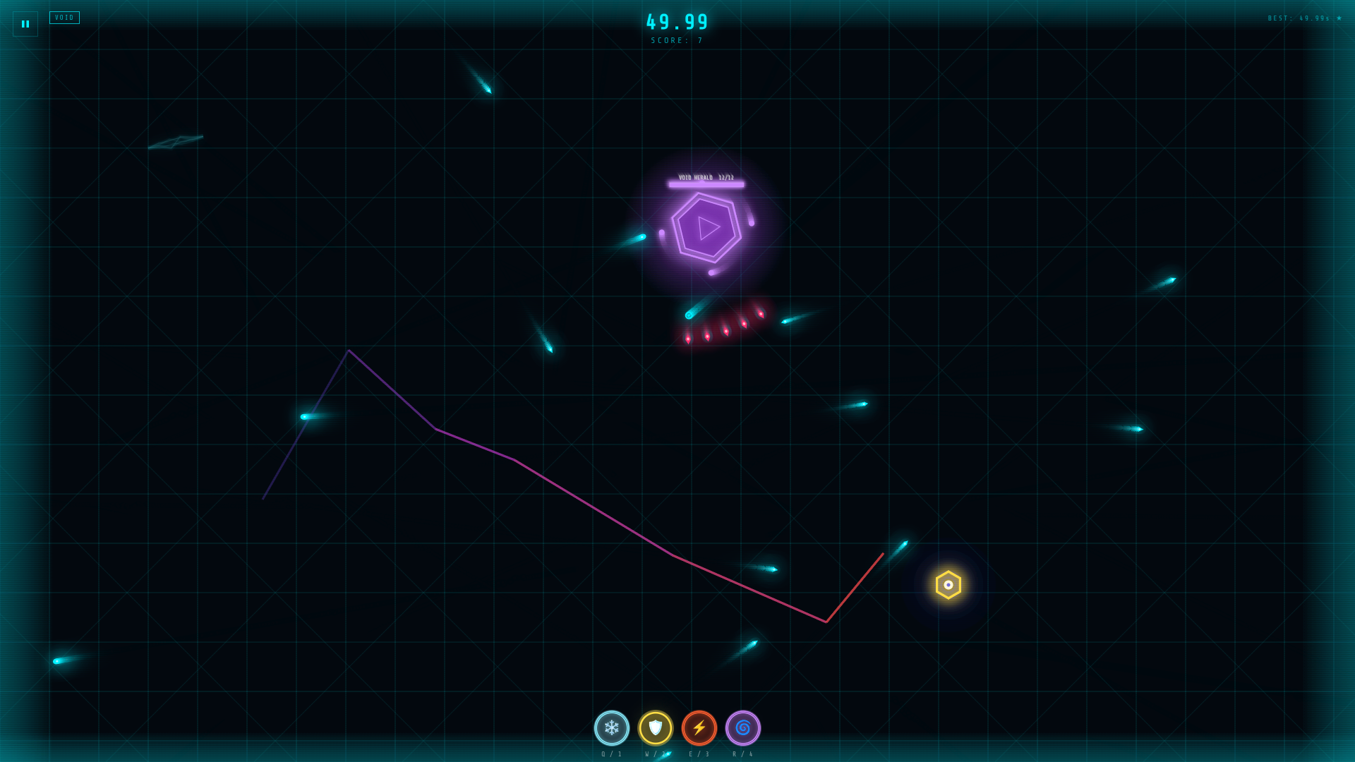 4 active skills — Freeze, Shield, Pulse, Blink — each with cooldowns and permanent upgrades. Two bosses emerge as you survive longer: the Void Herald and the Void Weaver. Reach 180 seconds to trigger Prestige.